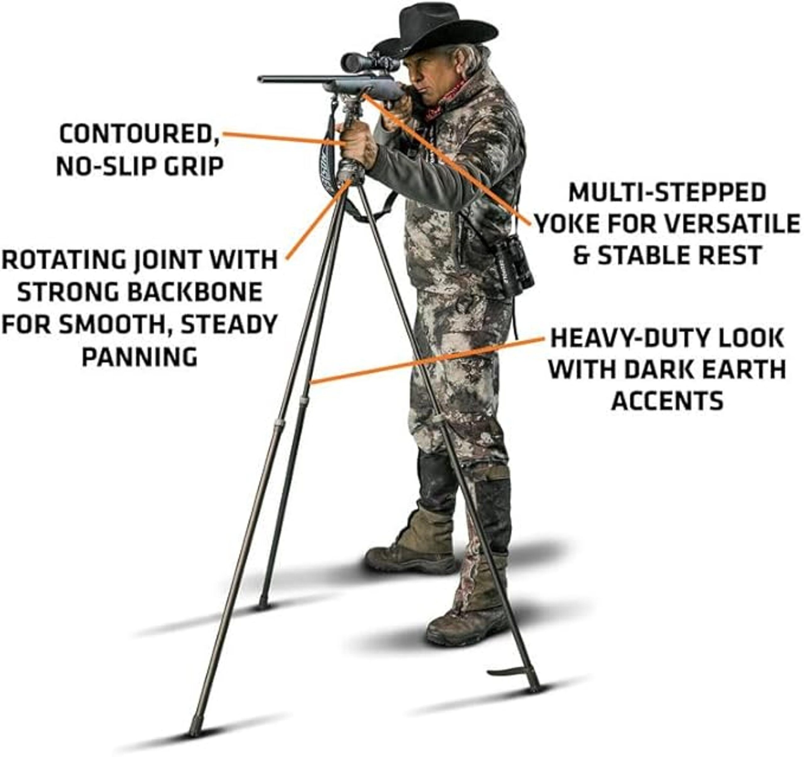 Тренога оснащена системой быстрого настройки, что позволяет легко и быстро регулировать высоту. Специальный триггерный механизм обеспечивает бесшумное и точное регулирование, что является важным аспектом для тех, кто занимается охотой. Вы сможете быстро адаптироваться к меняющимся условиям, не теряя время на настройку.