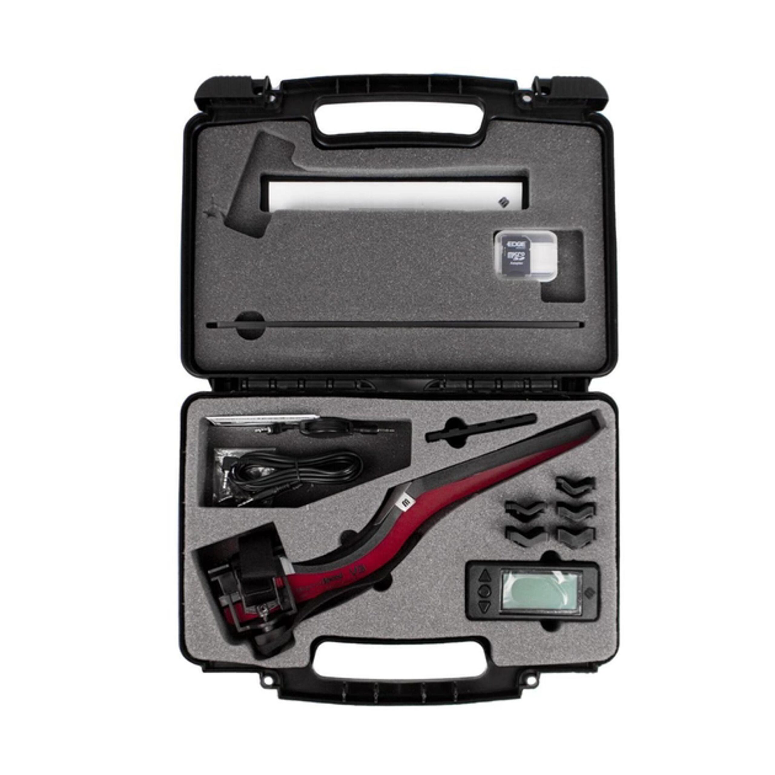 Комплектация хронографа включает в себя кейс, который обеспечивает его защиту во время транспортировки и хранения. Кейс имеет удобную ручку и закрывается на замок, что позволяет хранить инструмент в безопасности. Кроме большего диаметра, устройство имеет также больший зазор у дульного среза, таким образом, может устанавливаться на стволы с ДГК и глушителями примерно 3 дюйма в длину. Имеет простой дисплей, управляемый одной кнопкой (показывает скорость последнего выстрела и статистику, включается автоматически при подключении провода). Легко доступное батарейное отделение, которое не требует наличия отвертки для замены батарей. Встроенная удобная система крепления на ремень с металлической пряжкой и треугольной прессующей гайкой. Питается от батареи 9 вольт