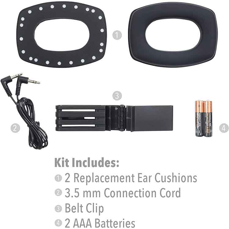 Также имеется вход AUX и шнур 3,5 мм для подключения MP3-плееров, раций и т. д. Две батареи AAA (в комплекте) обеспечивают примерно 150 часов работы, а четырехчасовое автоматическое отключение предотвращает ненужную разрядку.