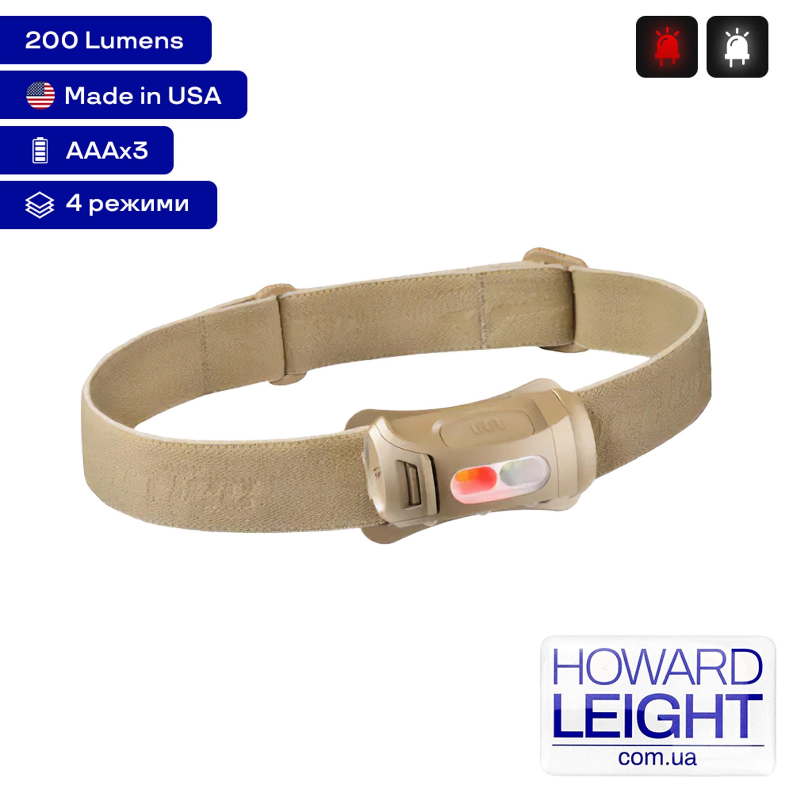 Фонарь имеет 4 режима работы – 2 режима освещения ближнего света, при этом может быть задействован красный светодиод, который обеспечивает “ближний” свет, который не ослепит собеседников. Максимальная яркость светового потока составляет 45 лм. Фонарь влагонепроницаемый, оснащен доступным отсеком для элементов питания. Включение и выключение, переключение режимов производится с помощью кнопки на корпусе фонаря. Регулируемый эластичный ремешок обеспечивает комфортное ношение фонаря на голове. Для включения режима дальнего освещения (3 светодиода) нужно нажать и удерживать кнопку 2 секунды.